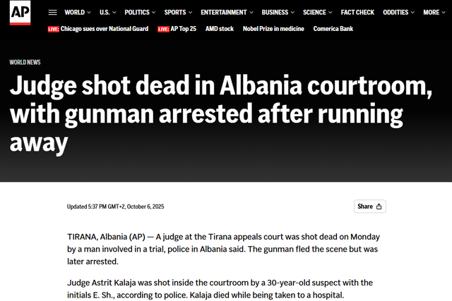 Një ngjarje e paprecedentë ka tronditur pasditen e sotme Tiranën. Brenda ambienteve të Gjykatës së Apelit, një 30-vjeçar i identifikuar si Ervis Shkëmbi ka hapur zjarr gjatë një seance gjyqësore, duke qëlluar për vdekje gjyqtarin Astrit Kalaja dhe plagosur dy persona të tjerë.
