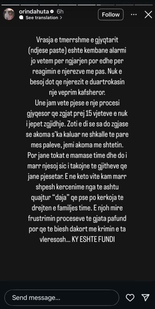 Moderatorja e njohur Orinda Huta ka shpërthyer në një reagim emocional pas vrasjes së gjyqtarit Astrit Kalaja, duke e cilësuar ngjarjen si një “kambanë alarmi” për shoqërinë shqiptare. Në një postim në rrjete sociale, ajo shprehu indinjatën e saj jo vetëm për aktin e rëndë, por edhe për mënyrën se si disa njerëz në publik reaguan ndaj tij.