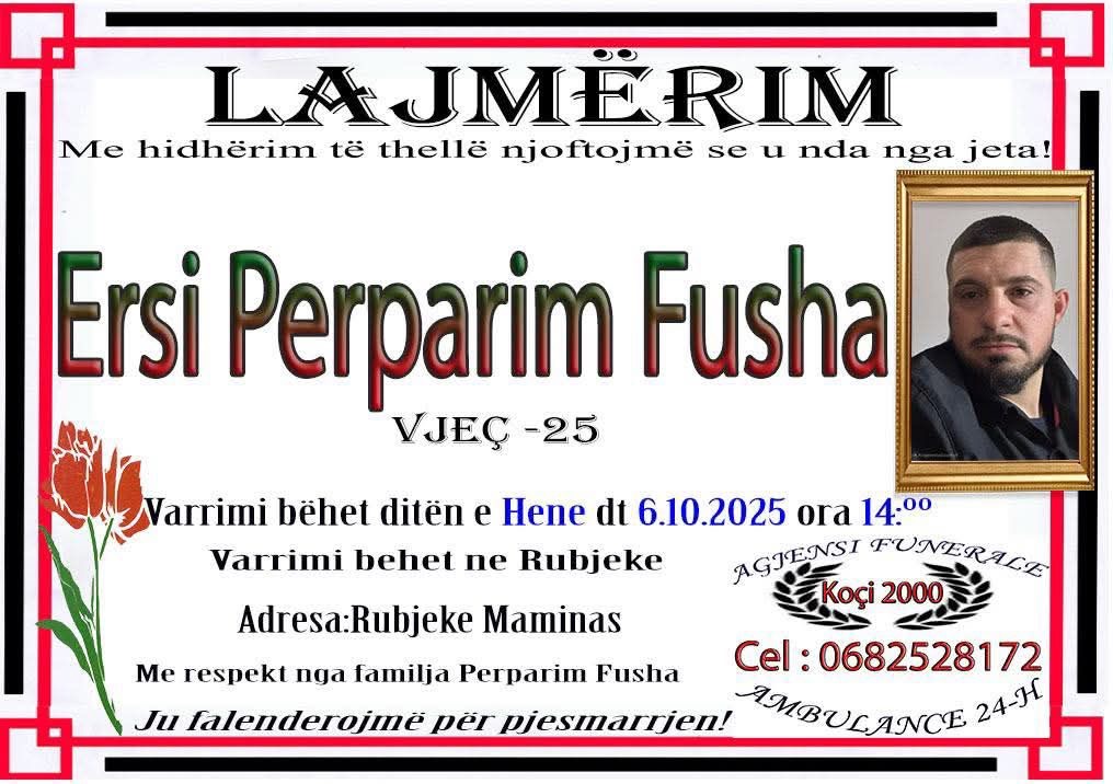 Varrimi i tij do të zhvillohet sot, më 6 tetor, ora 14:00, në fshatin Rrubjekë të Maminasit. Ngushëllime të sinqerta familjes Fusha për këtë humbje të parakohshme. Kujtimi i Ersit do të mbetet i gjallë tek të gjithë ata që e deshën.